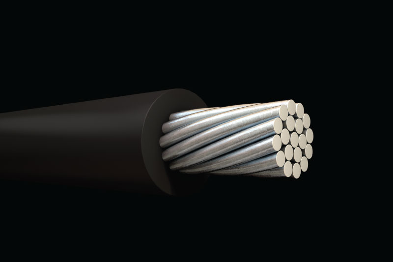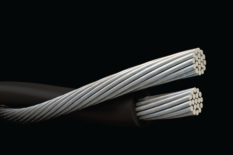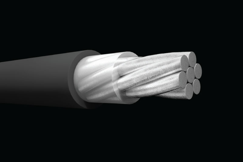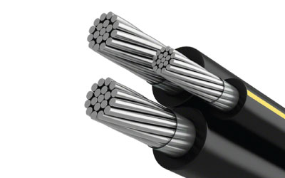 Conductor de aluminio 1350-H19 concéntrico o comprimido, aislamiento de polietileno reticulado. Conductores aislados de superficie impresa, neutra, triple franja amarilla o amarillo sólido. Los neutrales negros pueden especificarse si se desea.